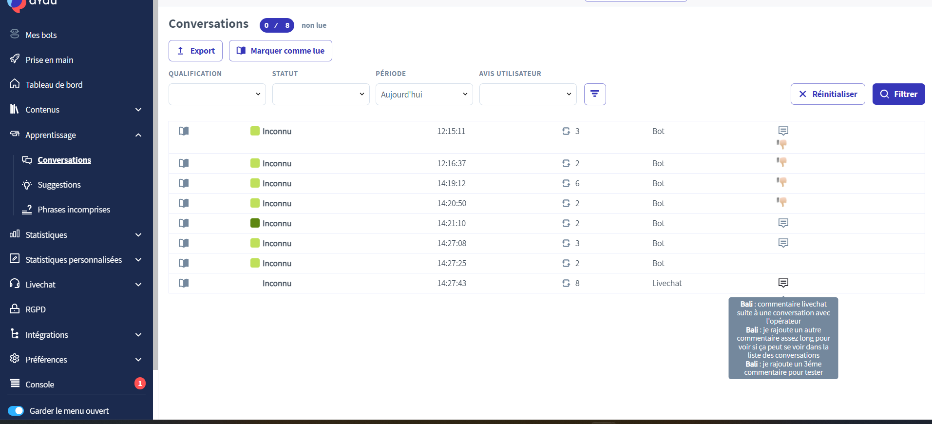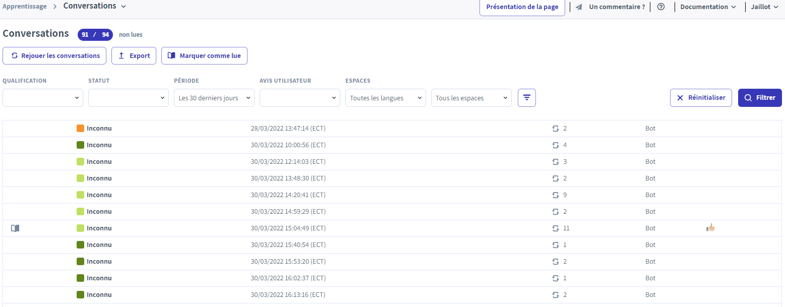Les internautes ayant la possibilité de donner leur avis sur la réponse du chatbot, ce filtre permet d'afficher les conversations en fonction de l'avis des utilisateurs.