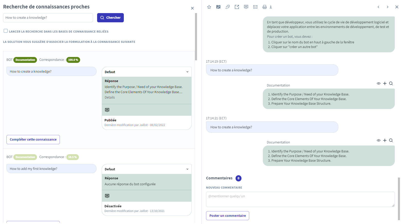Une fois la connaissance identifiée, il suffit de cliquer sur le lien **Compléter cette connaissance**. Une fois la formulation associée à la connaissance, dès qu'un internaute posera une question proche de celle ajoutée, le bot fournira la réponse de la connaissance correspondante.