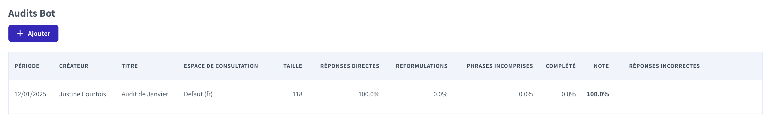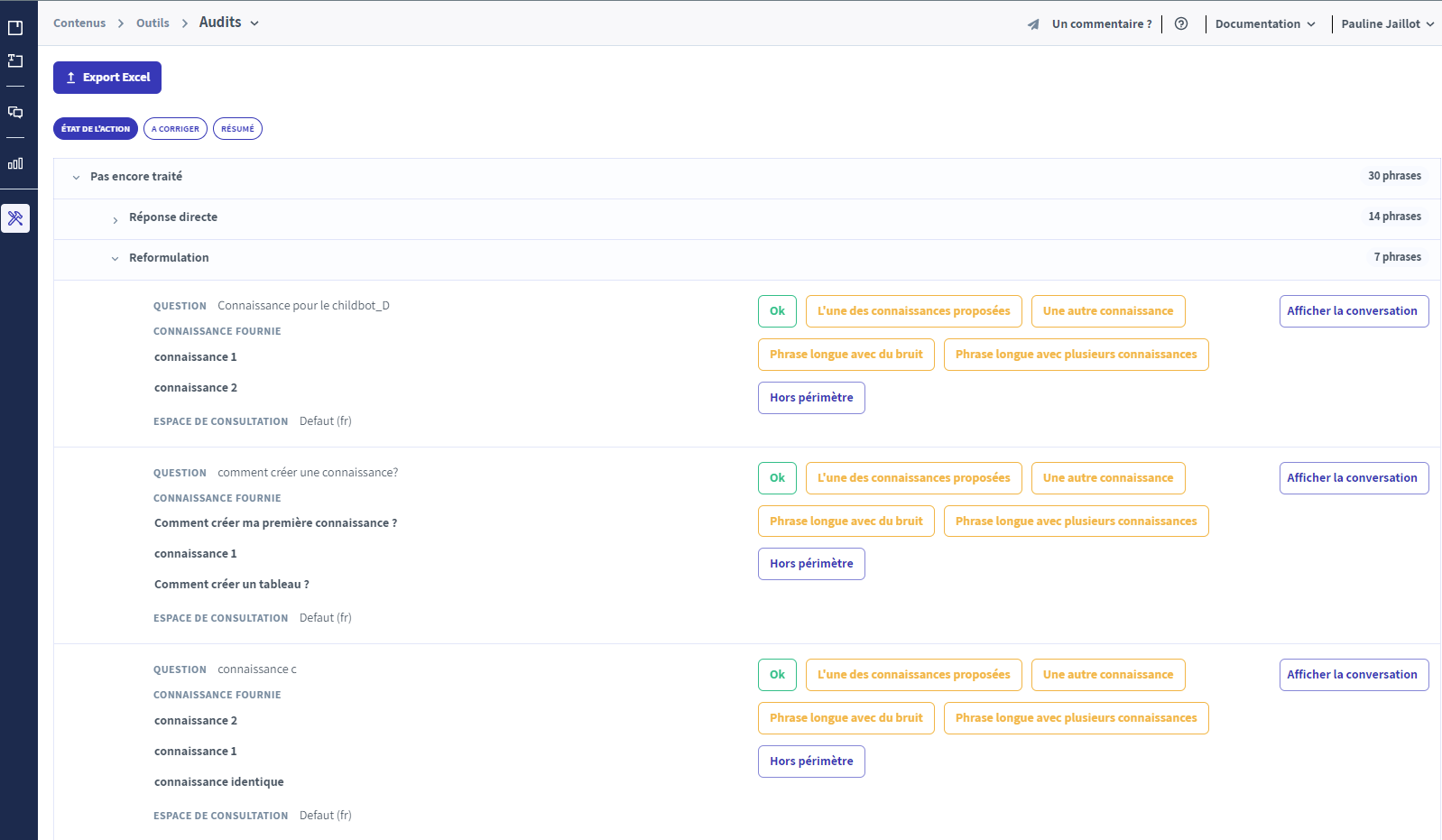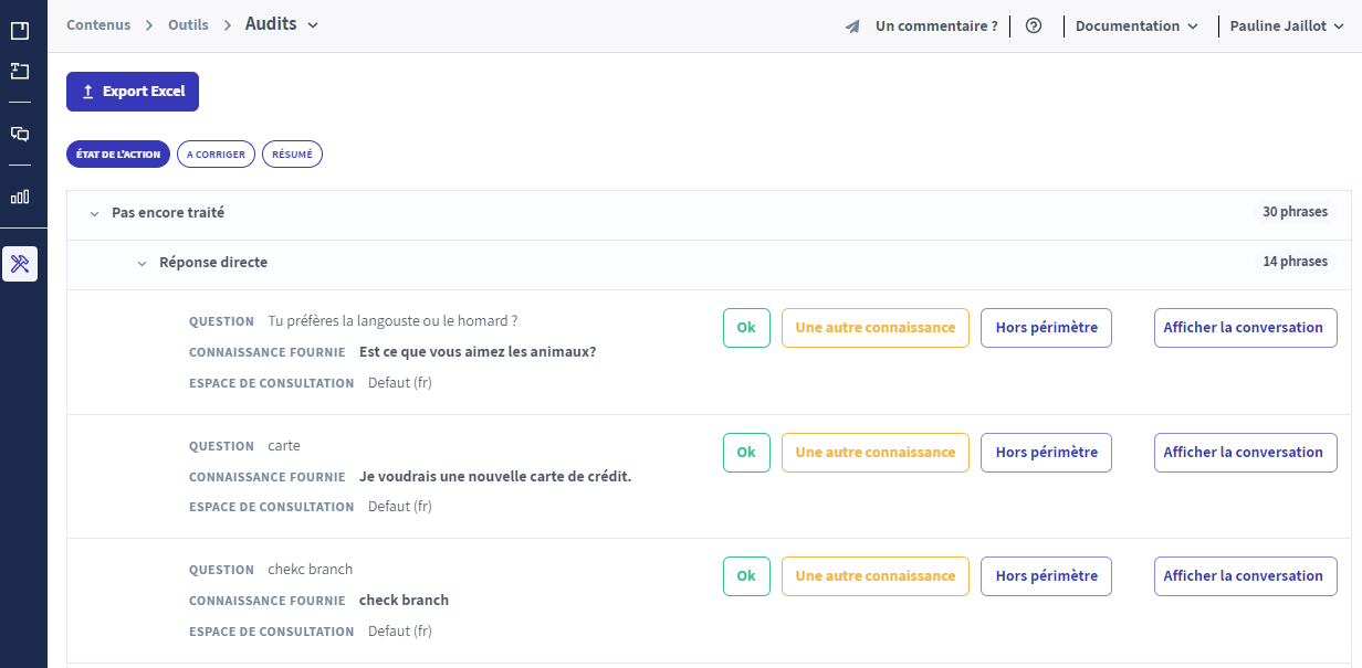 Par exemple, l'audit va permettre au manager du bot de confirmer ou non les réponses données par le bot, de valider que le bot a choisi la bonne connaissance permettant ainsi de détecter les faux positifs.
