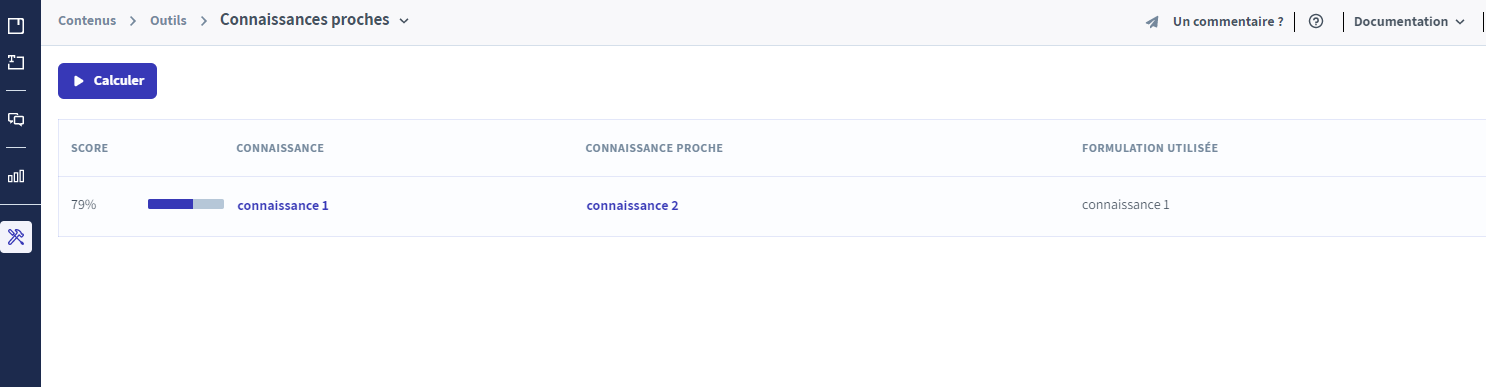 Ce menu permet de repérer les connaissances dont les formulations de questions sont proches. Il permet de se rendre compte, par exemple, que deux connaissances pourraient en réalité en être qu'une seule.