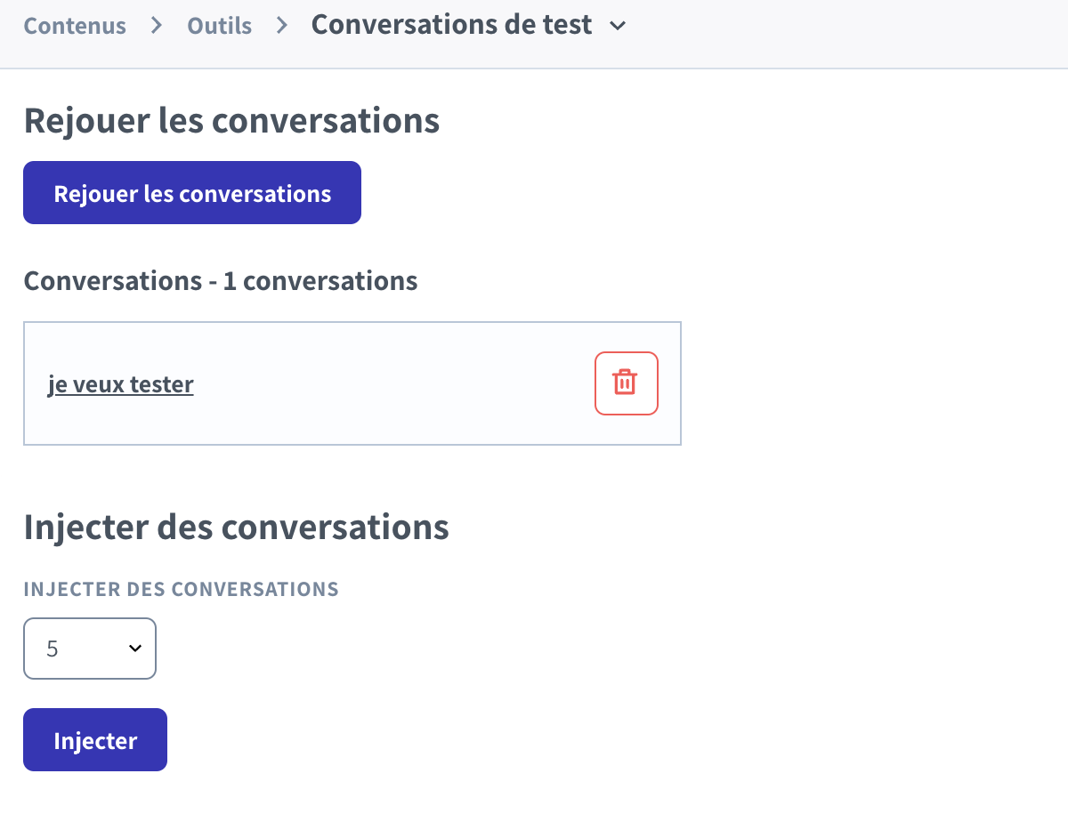 4. Retournez ensuite sur le menu **Conversations tests** et vous pourrez ainsi rejouer les conversations pour vous assurer que le bot répond toujours comme attendu. Allez dans **Contenus > Outils > Conversations tests**