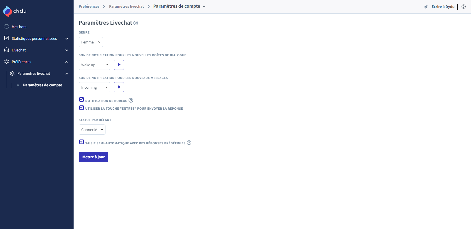 La page qui s'affiche comporte uniquement les [paramètres livechat](https://docs.dydu.ai/livechat/livechat-dydu/configuration-livechat-dydu/parametres-de-compte#parametres-livechat) modifiables par un opérateur.