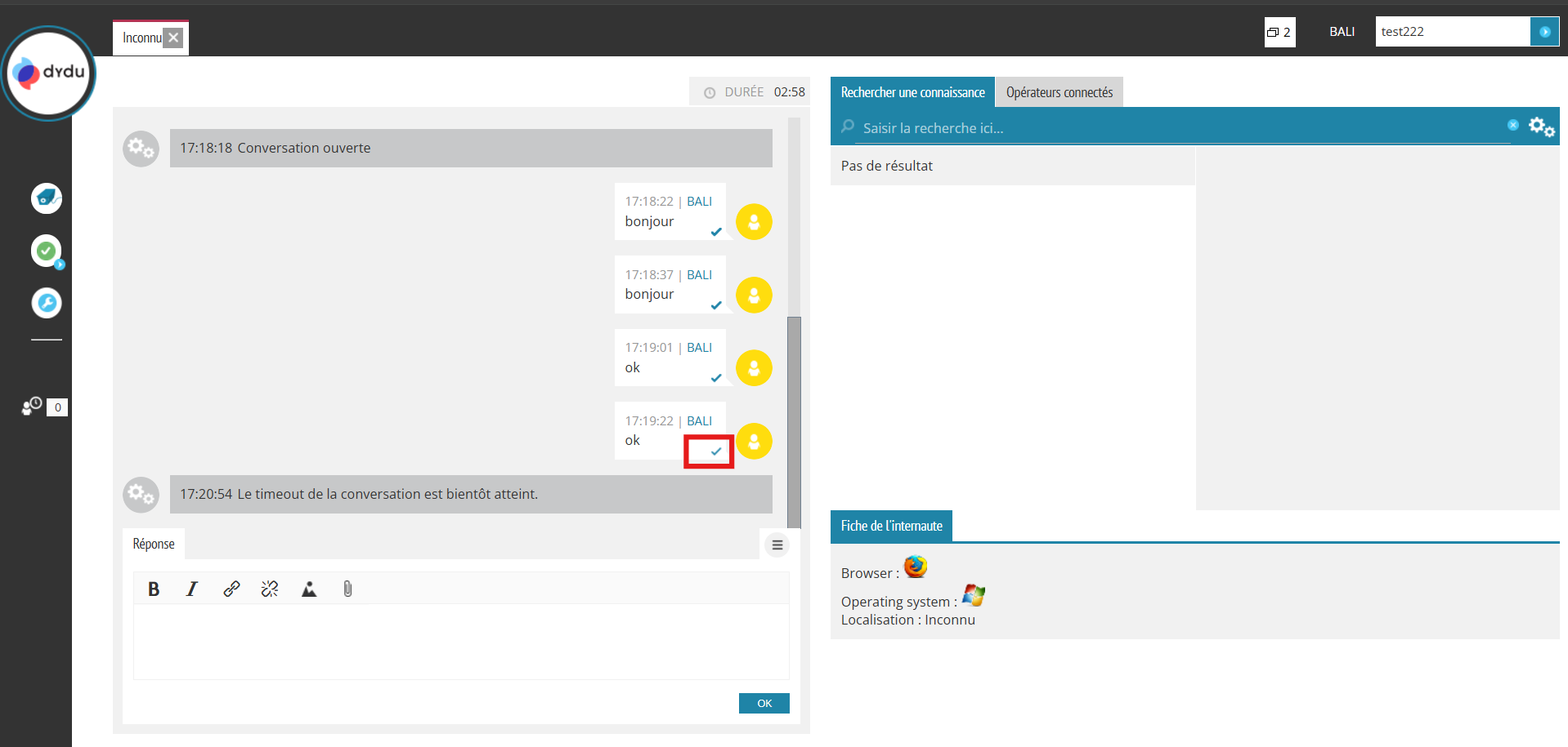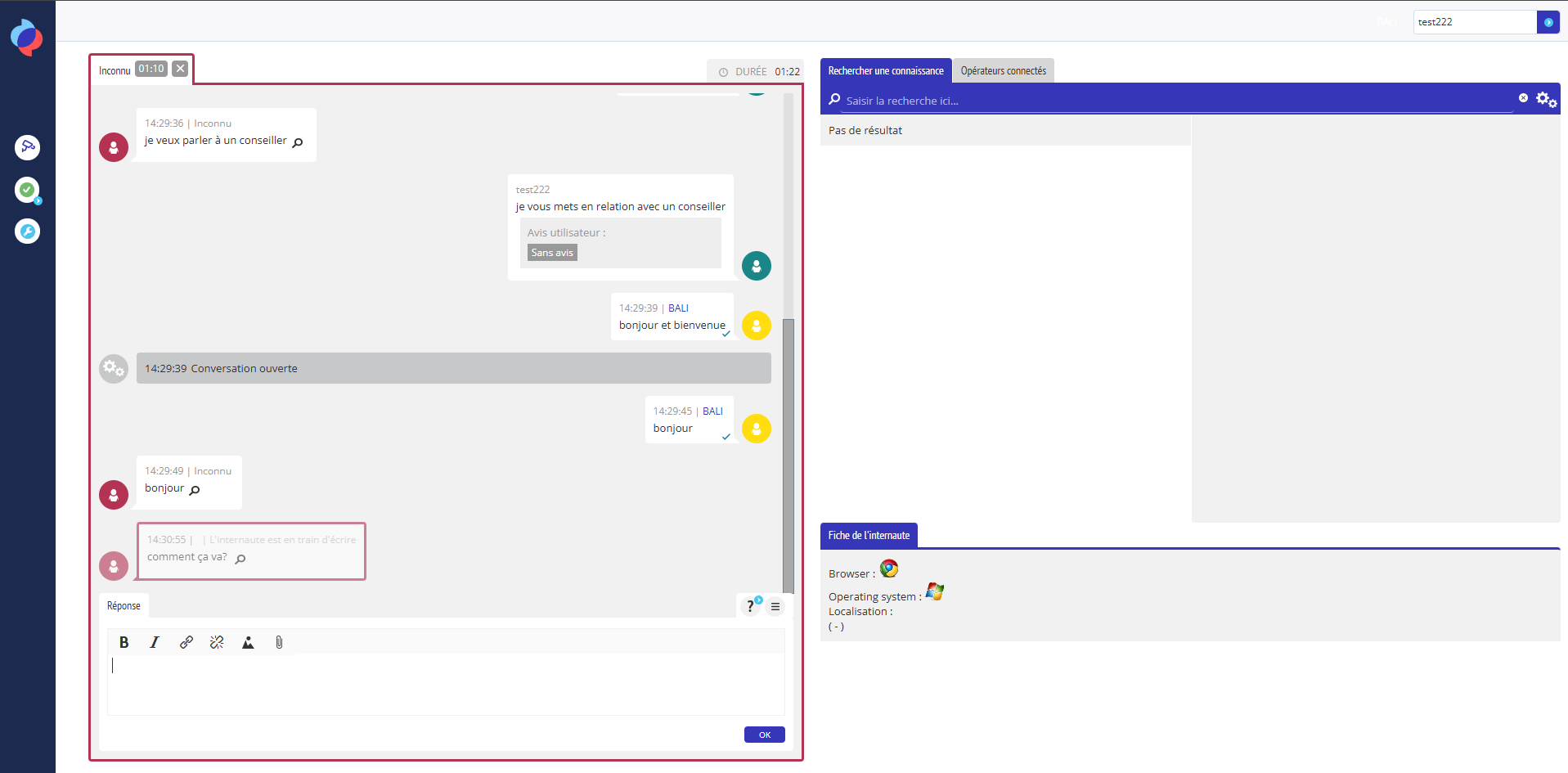 * **Recherche l'information :** lorsque l'opérateur passe sur ce statut, il est indiqué à l'internaute que celui-ci est en train de chercher l'information. S'il met du temps à revenir dans la conversation, il lui est envoyé une notification pour lui indiquer que l'opérateur est encore en train de chercher l'information.