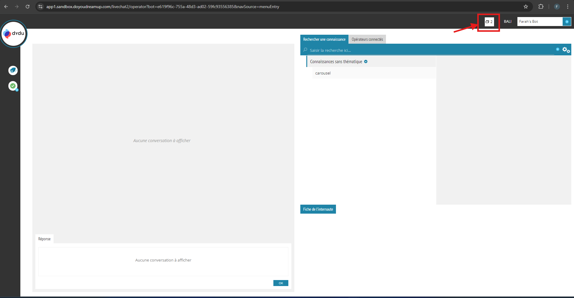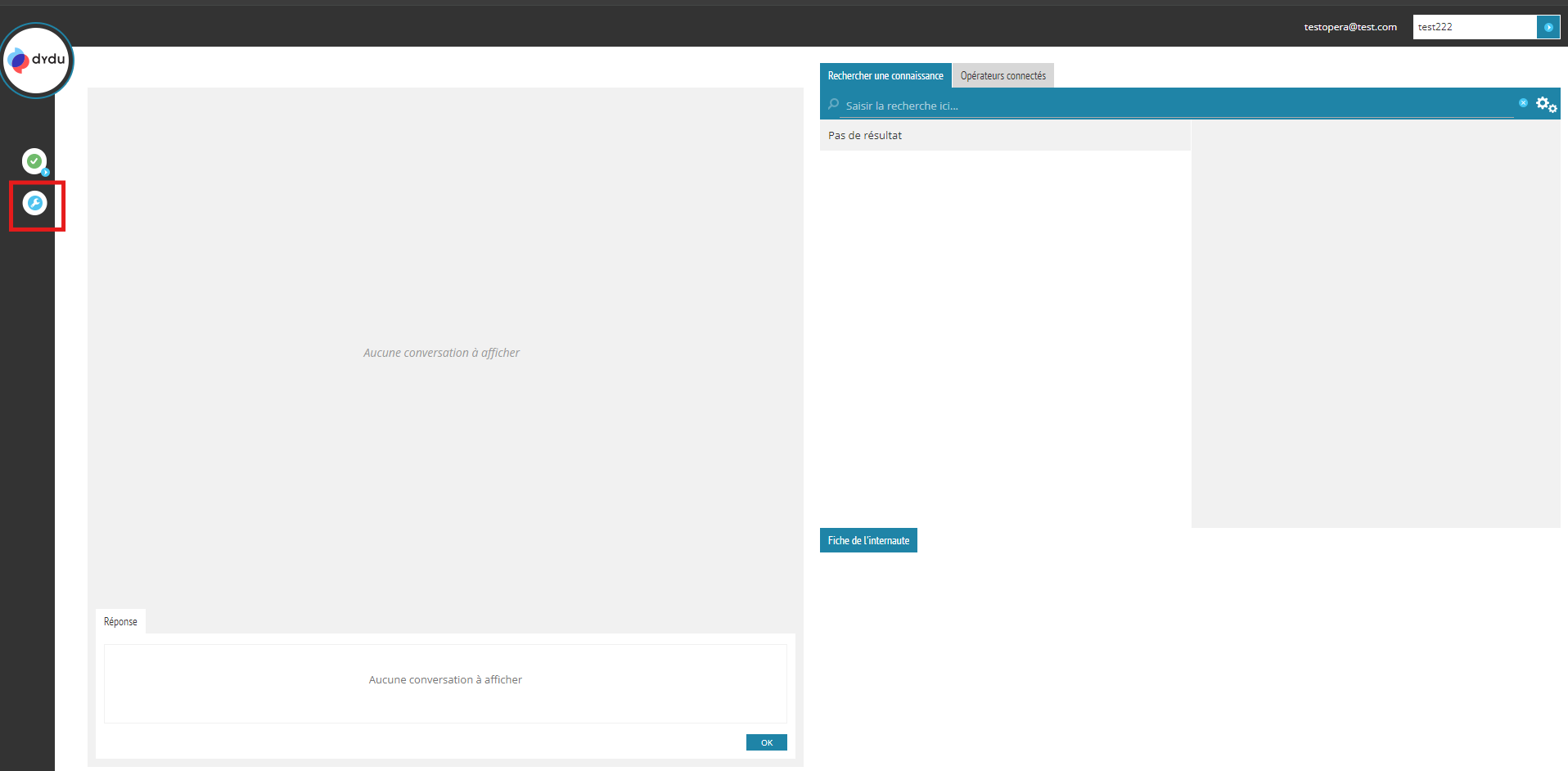 Il est également possible de rechercher automatiquement une connaissance à partir de la question d’un utilisateur en cliquant sur la loupe à côté de la question de l’utilisateur.