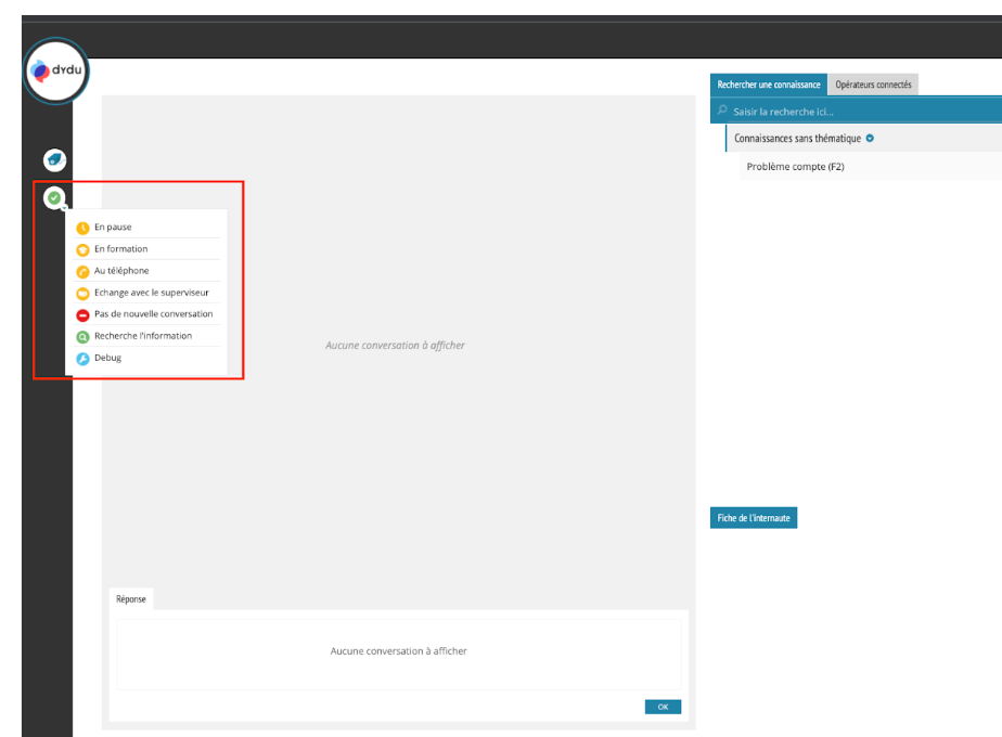 * **Pas de nouvelle conversation :** lorsque l'opérateur gère une conversation compliquée, il peut passer sur ce statut pour ne pas qu'on lui attribue de nouvelles conversations ;