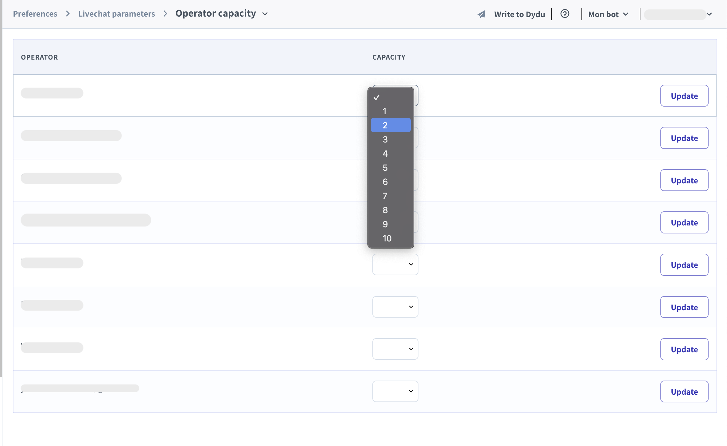 Pour chaque opérateur, il est possible de configurer le nombre maximum de conversations qui peuvent être gérées simultanément. Le nombre maximum de conversations simultanées par opérateur est limité à 10. Lorsque le maximum de conversations simultanées possibles est atteint pour chaque opérateur, les utilisateurs finaux peuvent passer à la file d'attente.