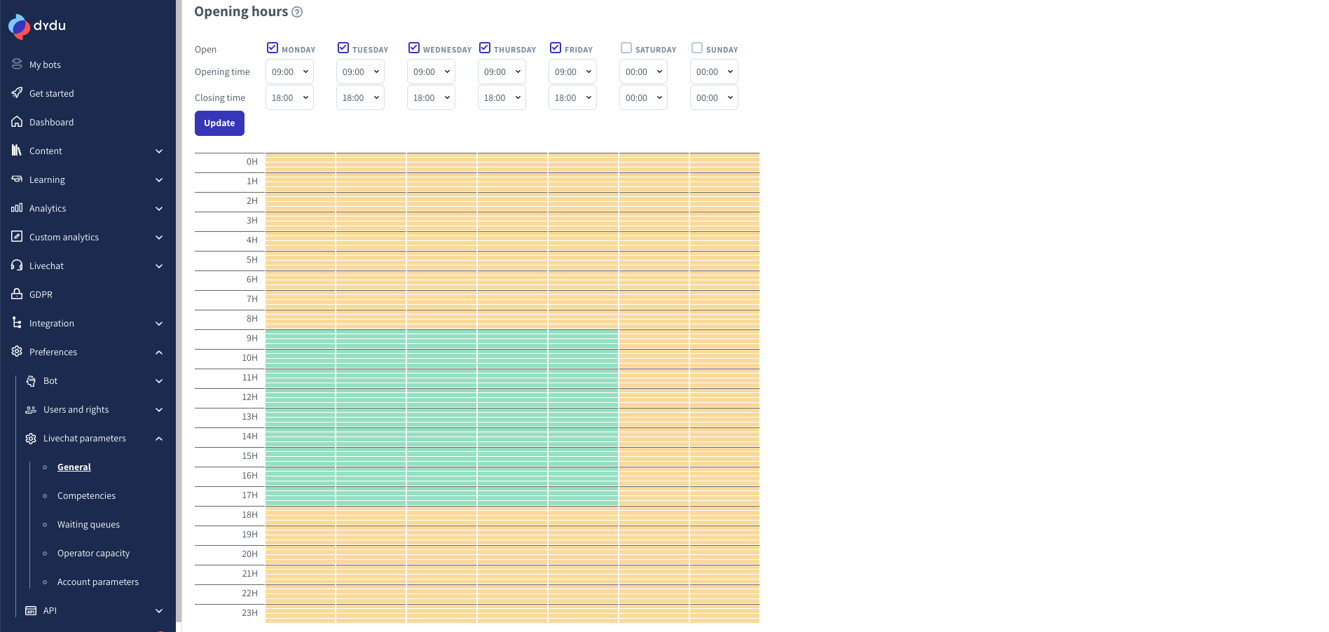 Vous pouvez ici choisir les horaires d'ouverture du Livechat sur les jours de la semaine. Ces horaires peuvent être définis par compétence.