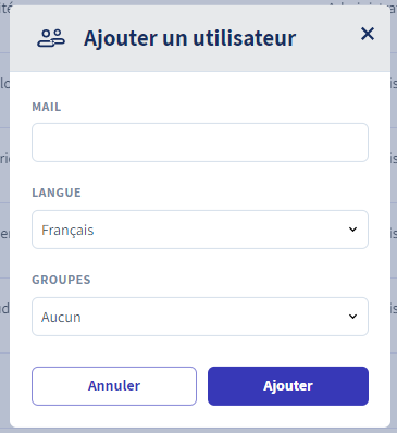 3. Saisissez l'adresse mail de l'utilisateur puis sélectionnez sa langue ainsi que son groupe utilisateur.