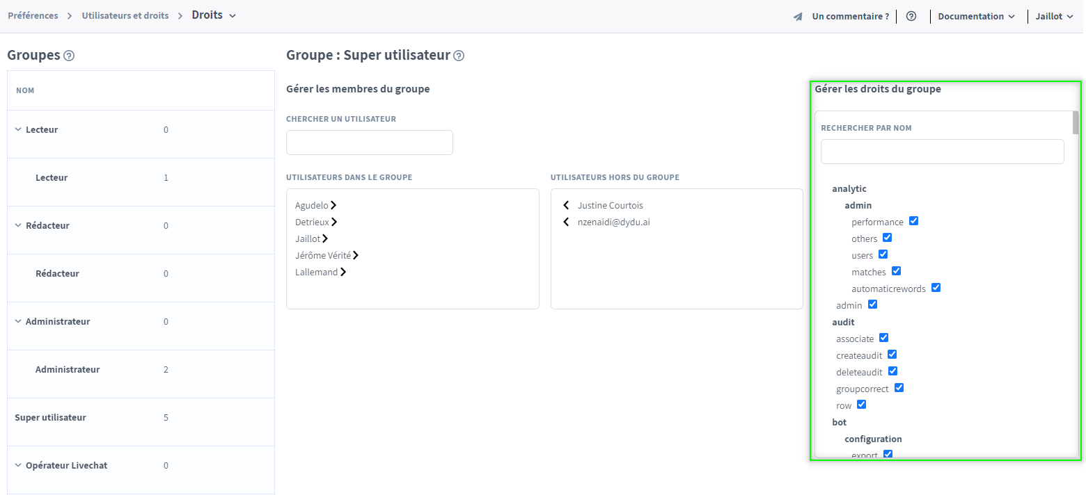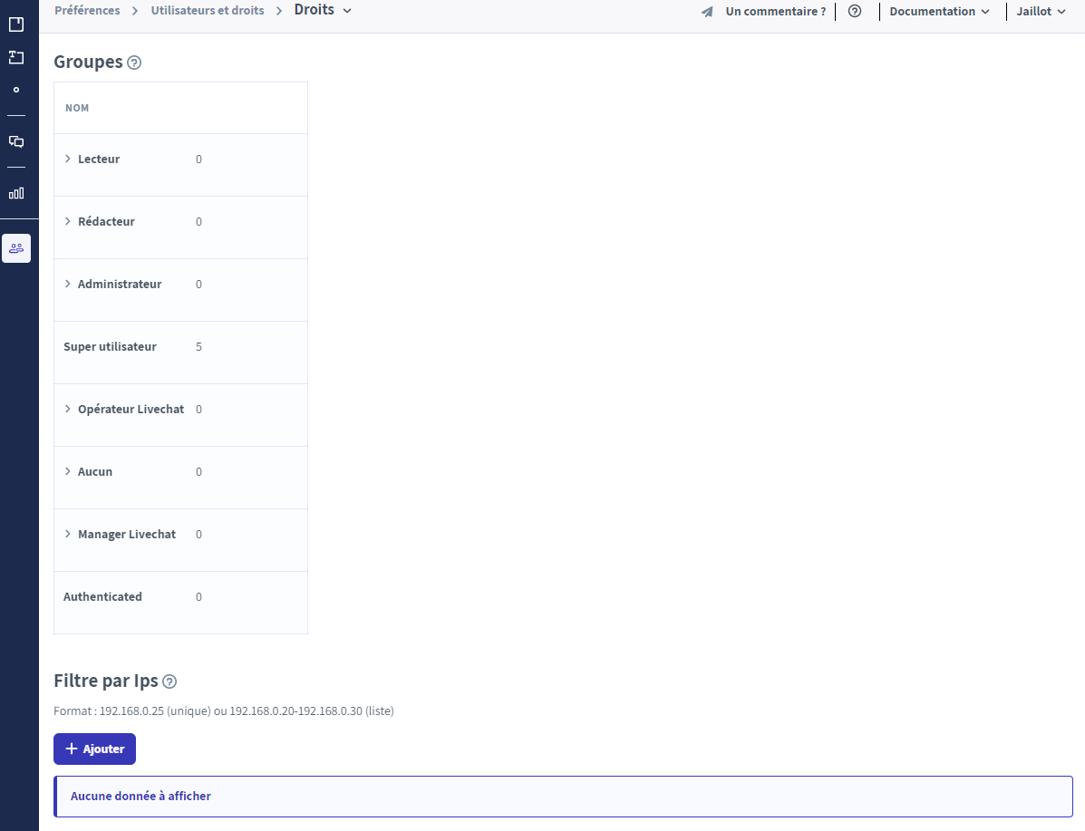 Afin de gérer les droits et utilisateurs, dirigez-vous sur la page des **Préférences > Utilisateurs et droits > Droits**.