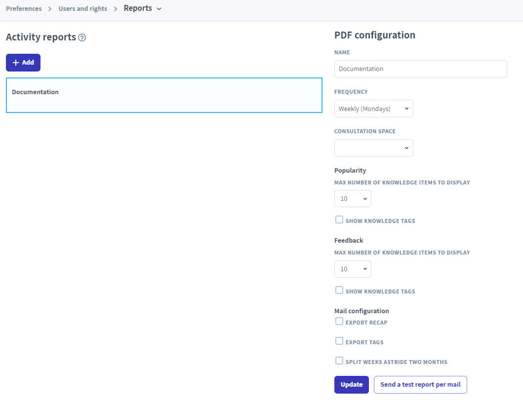 Pour cela, allez dans **Préférences > Utilisateurs et droits > Rapports**.