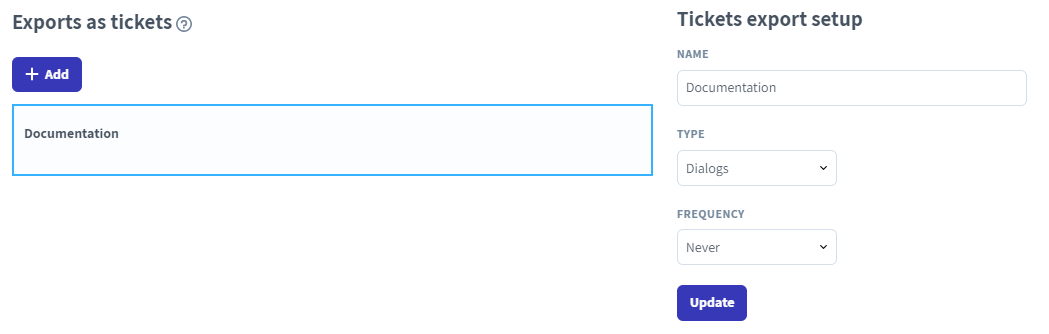 La rubrique **Exports sous forme de tickets** vous permet de configurer un export automatique de rapports de vos conversations (début de session, fin de session, opérateurs, compétences, etc.). Pour cela, cliquez sur **Nouveau** puis inscrivez le nom de configuration. Cliquez sur la coche bleue.&#x20;