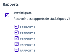 Pour rendre effective l'envoi régulier du rapport par e-mail, allez dans **Compte > Rapports**. Cochez la case "Statistiques" et sélectionnez les rapports que vous souhaitez recevoir par e-mail.