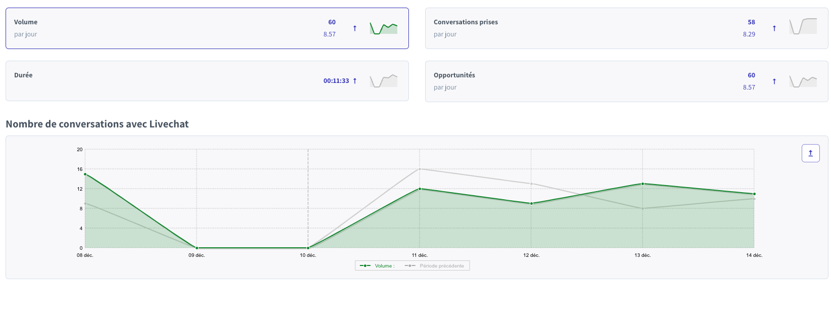 Les statistiques de conversations livechat porte sur le volume et la durée. Le gestionnaire du bot peut obtenir :&#x20;